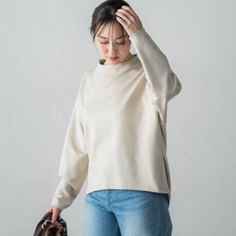 ネックは詰まりすぎないクルーネックで、顔まわりをすっきりと見せつつ上品な印象に。