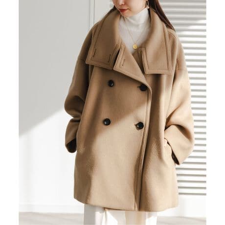 マニッシュな印象に女性らしさを感じられるスタンドカラーコート。