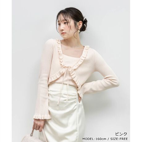 コンパクトなタンクトップとフリルカーディガンがセットになったニットアンサンブル。