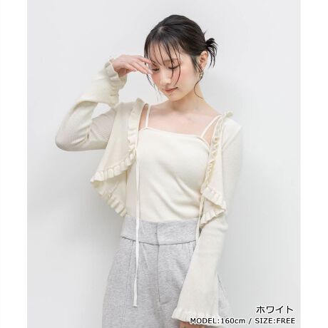 コンパクトなタンクトップとフリルカーディガンがセットになったニットアンサンブル。