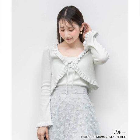 コンパクトなタンクトップとフリルカーディガンがセットになったニットアンサンブル。