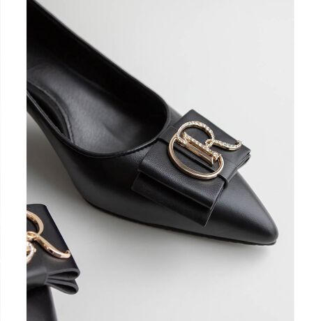 上品なビジューをあしらったモノグラムリボンデザインが魅力のポインテッドトゥパンプス。