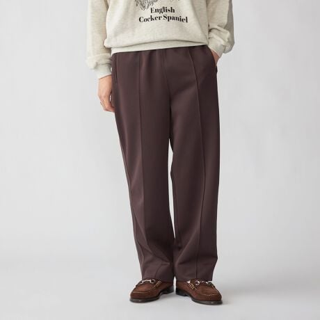 スラックスと同様の下にストンと綺麗に落ちるパターン設計で丁寧に作ったラインジャージーパンツ。