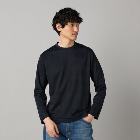 チェック柄と裾リブ使いがポイントのTシャツです。