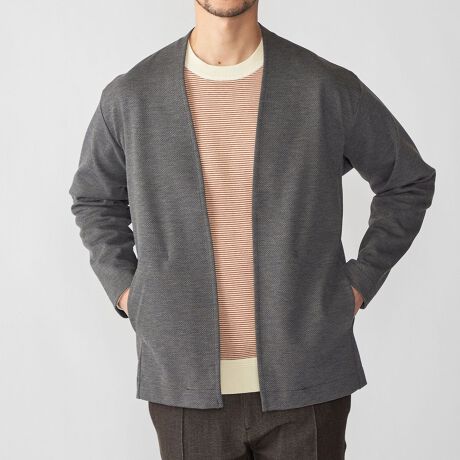 ジャケット感覚でキレイ目に羽織れるノーカラーカーディガン。
