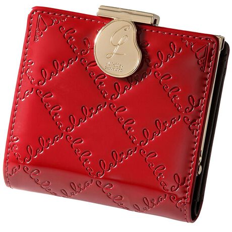 Cleliaのロゴを一面に型押しした、光沢が美しいエナメル二つ折り財布。