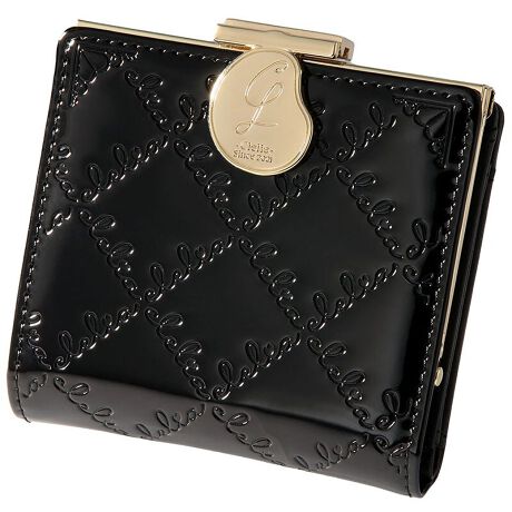 Cleliaのロゴを一面に型押しした、光沢が美しいエナメル二つ折り財布。