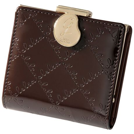 Cleliaのロゴを一面に型押しした、光沢が美しいエナメル二つ折り財布。