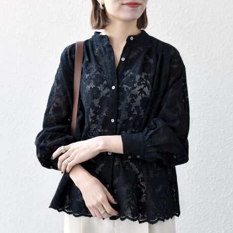 レースならではの透け感とフラワーモチーフの華やかさが魅力のシャツブラウス。