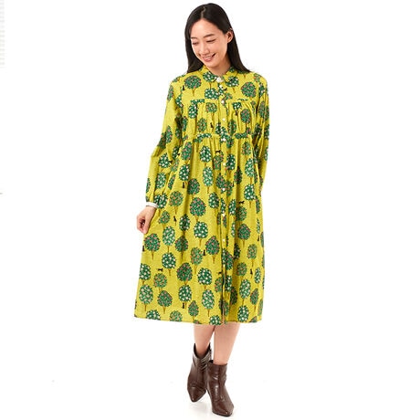 肌触りの良いコットンシャンブレーのプリントワンピース。