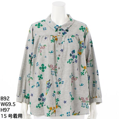 肌触りの良いコットンシャンブレーのAラインのプリントブラウス。