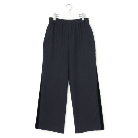 ■デザインサイドにあしらわれたベルベットテープが、上質な艶めきを放つトラックワイドパンツです。柔らかな肌触りと程よい伸縮性を備えた生地に、ウエストゴム仕様で快適な履き心地を実現しました。スポーティーなアイテムでありながら、すっきりとしたワイドシルエットと光沢感のあるディテールが大人のスタイルに上品さをプラスします。デイリー使いはもちろん、ワンランク上のカジュアルコーデにも活躍する一枚です。ベルベットテープのカラーはベージュ(033)がオフホワイト、ネイビー(075)がネイビー、ブラック(005)がブラックです。