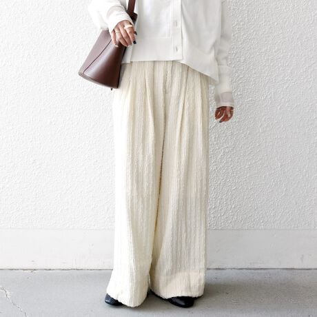 表情のある素材を活かした、シンプルながら存在感のあるワイドパンツ。