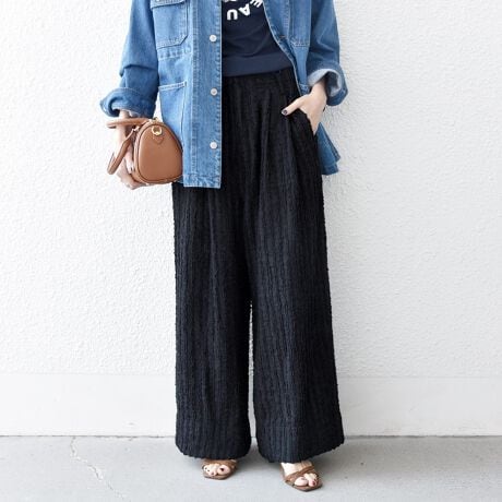 ワイドシルエットながら落ち感があり、ショート丈トップスとも好相性です。