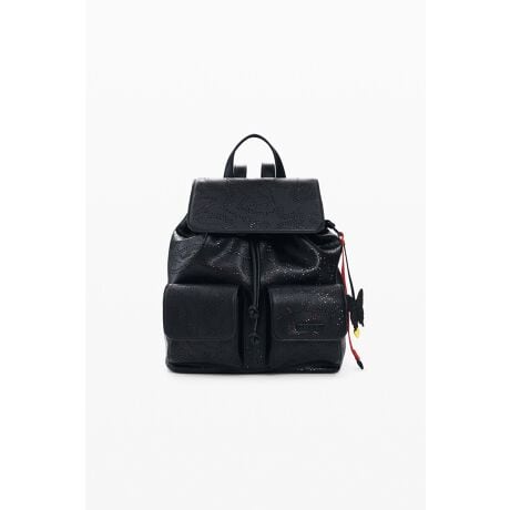 小型のバックパック、前面に2つのポケット、花の形の型抜きのディテール、調節可能なドローストリング付きの留め具。