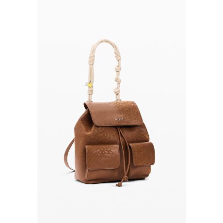 刺繍のディテールが施されたフラップ付きの小さなバックパック、フロントポケット、チャーム付きの取り外し可能なハンドル。