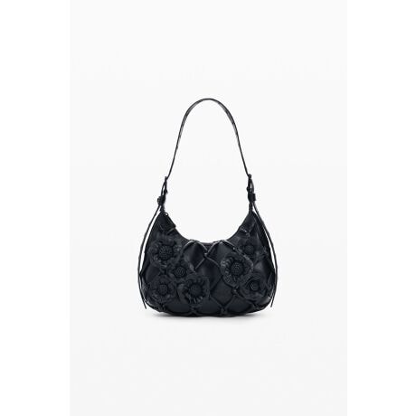拡張可能なストラップ、小さな花の装飾、ネットスタイルのラインのディテール、菱形の形状のレザー風効果を備えた小さなバッグ。