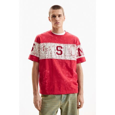 ビビットな赤にDesigualのアルファベットがプリントされた、メンズサイズの半袖Tシャツ。