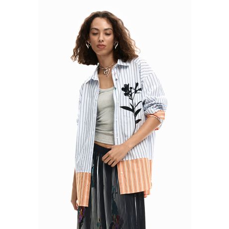 2色のストライプ柄と前面に花柄プリントが施されたオーバーサイズスタイルのロングシャツ。