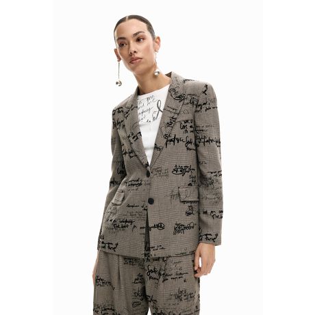 クラシックなカットのジャケットに、チェック柄の上に印刷されたDesigualのテキストデザイン。