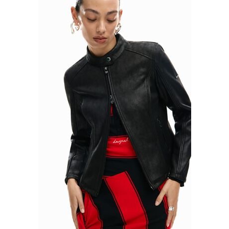 フェイクレザーのヴィンテージ風ジャケット、スリムフィット、マオカラー、ジッパー開閉、フロントポケット付き。
