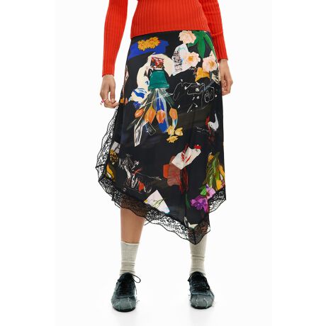 コラージュスタイルのサイコロ柄プリントとレースのディテールが施されたアシンメトリーな裾の流れるような生地のレギュラーフィットミディスカート。