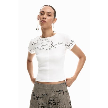 リブ素材の半袖Tシャツ、装飾的な縫い目と上部にレタリングスタイルのプリント付き。