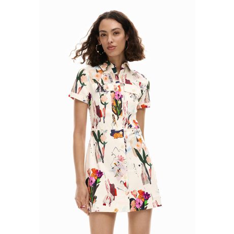 伸縮性のある生地で仕立てられた、ボタン付きの半袖ドレスで、花柄とDesigualのモチーフがコラージュ風にプリントされています。