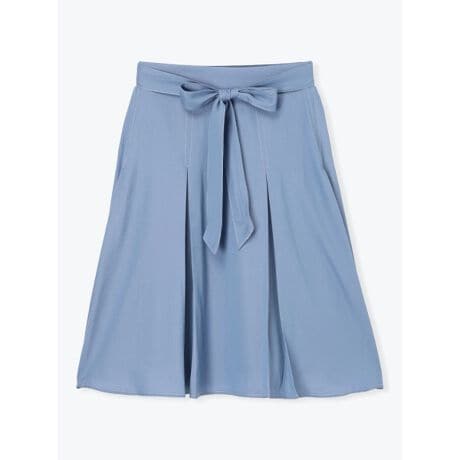 [型番:25580040014]配色ステッチのデザインが表情感を演出するスカート。ウエストにはリボンを施しており、女性らしいムードをプラスします。裾に向かってふんわりと広がるシルエットが魅力的。トップスをタックインしたメリハリのあるコーディネートがおすすめです。モデル(紺着用)身長:167cm Mサイズ着用