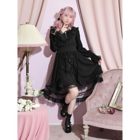 胸元のハートボタンやリボン、揺れ感の美しいティアードデザインがクラシカルな甘さを引き立てます。