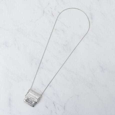 鏡面の光沢と細かな凹凸が交差して立体感を生み、シンプルながら存在感のある首元を演出します。