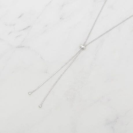 中央のメタルスライドパーツでトップの高さを自由に調整でき、Y字に落ちる両端の小さなストーンが動くたびにさりげない存在感を放ちます。