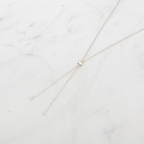 中央のメタルスライドパーツでトップの高さを自由に調整でき、Y字に落ちる両端の小さなストーンが動くたびにさりげない存在感を放ちます。