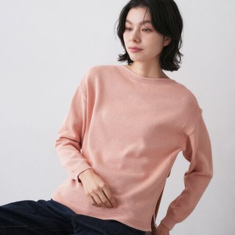 さらっとドライな肌触りと程良い肉感のミドルゲージでカジュアル過ぎずオフィスやランチ会にも対応できるキレイめニット。