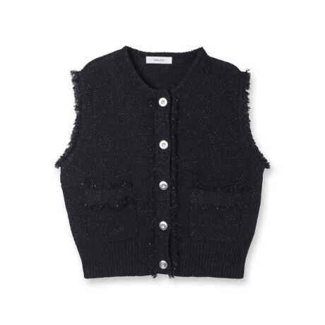 ラウンドネックにメタルボタンを並べ、前立てと肩、ポケット端にフリンジを施した華やかな一枚。