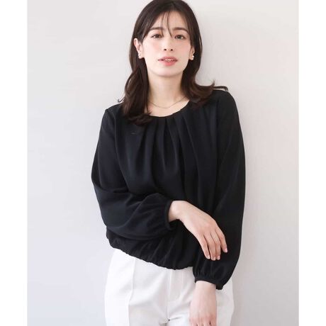 短めの丈感とバルーンのようになった裾デザインが印象的なブラウス。ボトムにインしなくても決まりやすいラクな着心地が嬉しい一枚です。シンプルな中にも首元をきれいに見せるネックラインとフロントのタックデザインがポイントに。