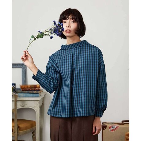 配色がかわいいギンガムチェックブラウス。身幅をたっぷりとった、ドロップショルダーのゆったりシルエットです。前後着用可能な2WAY仕様でボタン開きを前にするとショートカラー、後面を前にするとロールカラーと違った印象でおしゃれを楽しめます。コロンとしたボタンや、半端袖の丸みのあるカフスもデザインのこだわりポイントに。ややハリのある生地感で、体型カバーも叶うひと品です。