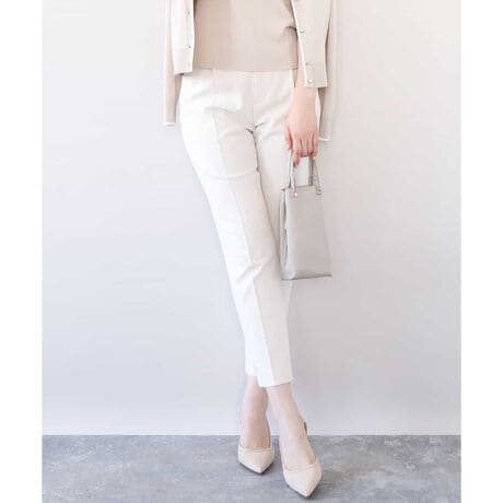すっきりとしたシルエットがきれい見えのブランド定番人気のテーパードパンツ。人間が立った状態の脚の形状に近い特別なボディーを使用しパターンを起こしているため、ヒップのトップ位置が高くヒップアップ効果があり、ストンとまっすぐ落ちるテーパードシルエットで足が真直ぐ見え、美脚効果が期待できます。フロントのホックは可動式で1.5cm動き、後ろのウエストゴム仕様と合わせてストレスフリーな履き心地を実現。