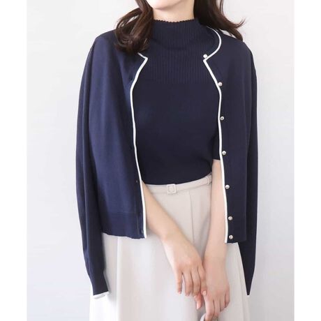 セットでも単品でも使い勝手の良いカーディガンとプルオーバーがセットになったアンサンブル。カーディガンはきれいめシーンにも映えるホワイトのライン配色が効いたデザインに。サイズ感やかたちはベーシックに仕上げることで汎用性も◎。半袖プルオーバーは幅違いのリブをヨークで切り替えたデザインで、一枚着としても着こなしやすいモックネック。