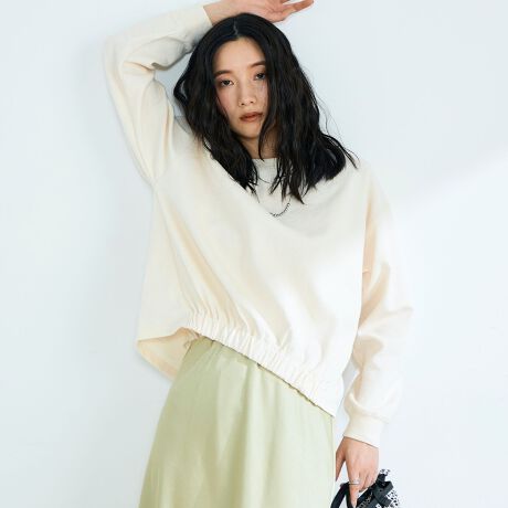 ・フロントのウエスト部分にギャザーのデザインを施し、インしなくてもバランスよく決まるシルエット