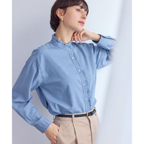 ・襟からフロントにかけて挟み込んだフリルがさりげないアクセントになり、甘さを抑えた大人カジュアルな印象に仕上げたシャツ。