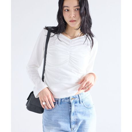 デコルテ周りがきれいに見えるようほどよくVネックにしています。コンパクトでありながら程よくゆとりのあるシルエットで、伸縮性もあるのでインナーとしてはもちろん、身頃とサイドにもギャザーのデザインポイントがあるのでトップスとしてもご着用いただけます。