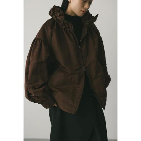 モデル身長172cm(FREEサイズ着用)襟にギャザーをたっぷりと寄せニュアンスをもたせた中綿入りブルゾン。上品な光沢感と適度な柔らかさとハリ感を合わせ持ったこだわりのナイロン素材を使用。ファスナーを上まで閉めたスタンドネックスタイルや少し開けて折り返した襟も楽しめます。後ろ襟に施された長めのドロストコードと深く入ったタックによりバックスタイルもこなれた印象に。ギャザーを寄せたゆったりとした丸みのある袖なので、厚手のニットも着用いただけます。裾は調整できるストッパー&ゴム仕様。ポケットあり。裏地あり。ストレッチなし、透け感なし。【お手入れ方法】マシンウォッシュ可