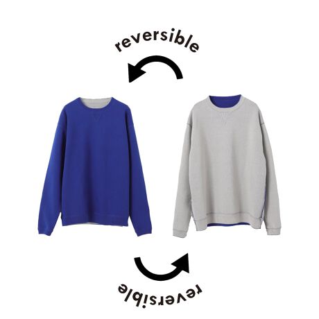 表裏の配色が特徴的な、リバーシブル仕様のクルーネックニット。