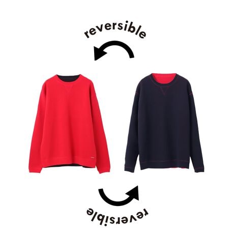 表裏の配色が特徴的な、リバーシブル仕様のクルーネックニット。