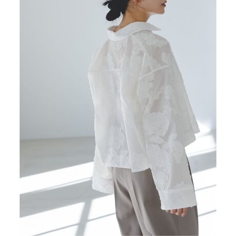シアー感のあるフラワージャガード素材が一見メンズライクなデザインに女性らしさをON。