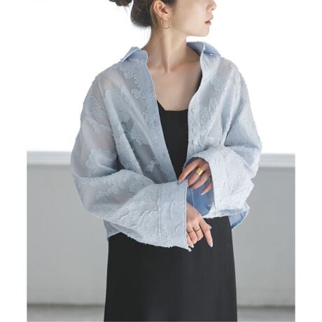 シアー感のあるフラワージャガード素材が一見メンズライクなデザインに女性らしさをON。