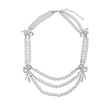 大小様々なリボンビジューが煌めくパールネックレス【Design】・上品な艶のパールに、きらりと輝くリボンモチーフがアクセントとなり、甘さの中にも洗練された印象のネックレス。・デイリー使いはもちろん、特別なお出かけやフォーマルシーンにも◎・シンプルなコーディネートに合わせるだけで、首元をぱっと明るくなります。・アジャスター付きで、サイズの調整が可能です◎