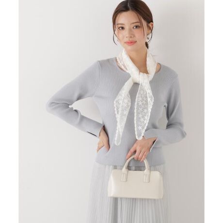 トレンドのレーススカーフ付きリブニット。丸みのあるスクエアネックが新鮮な表情に見せてくれます。大人っぽい刺しゅう入りレーススカーフは、首元に巻いたり、ラップ(巻き)スカート風やヘアアレンジにも使えます。
