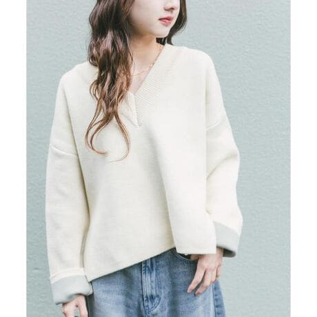 表地と裏地で異なるカラーを編み立てた、こだわりのダブルフェイス仕立て。ベーシックな表面カラーに対し、裏側には心躍るアクセントカラーを配しました。動くたびにさりげなく覗く裏側の色が、コーディネートに奥行きとリズムをプラス。袖を折り返したときに現れるコントラストカラーが、さりげないポイントになります。